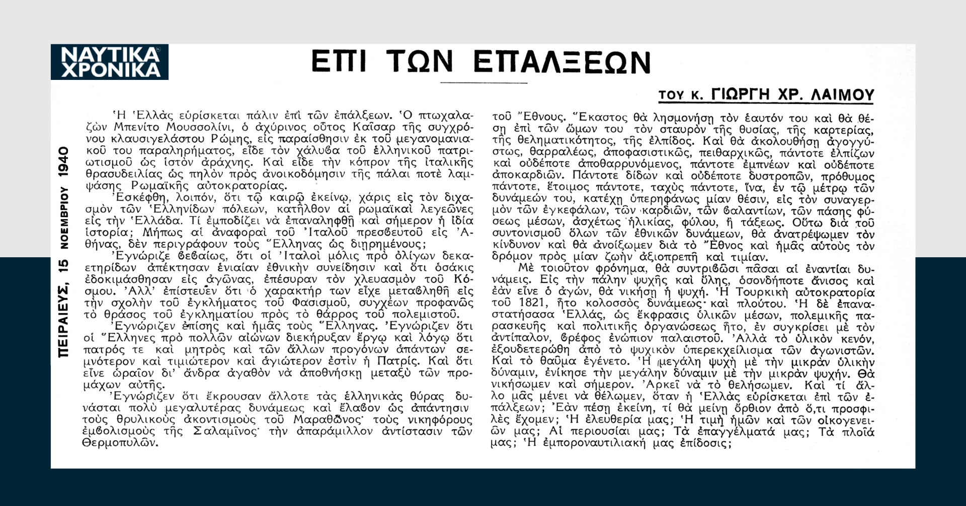 Μέσα από το κείμενο του Γιώργη Χρ. Λαιμού εκφράζεται η θέση της ελληνικής ναυτιλίας ενώπιον της εθνικής μάχης. Ο αρθρογράφος επιλέγει να παρομοιάσει τους σύγχρονούς του Έλληνες στρατιώτες με τους πολεμιστές του Μαραθώνα, της Σαλαμίνας και των Θερμοπυλών, θέλοντας να τονίσει αφενός τον ηρωισμό των αμυνομένων αλλά και την υπέρτερη ισχύ της επιτιθέμενης Ιταλίας. Οι ενδοκειμενικές του αναφορές, μάλιστα, στον δικτάτορα της γειτονικής χώρας ομοιάζουν με τις δημοφιλείς γελοιογραφίες που δημοσιεύονταν στον Τύπο της περιόδου: «Ο Μπενίτο Μουσσολίνι, ο αχύρινος ούτος Καίσαρ», σημειώνει χαρακτηριστικά.