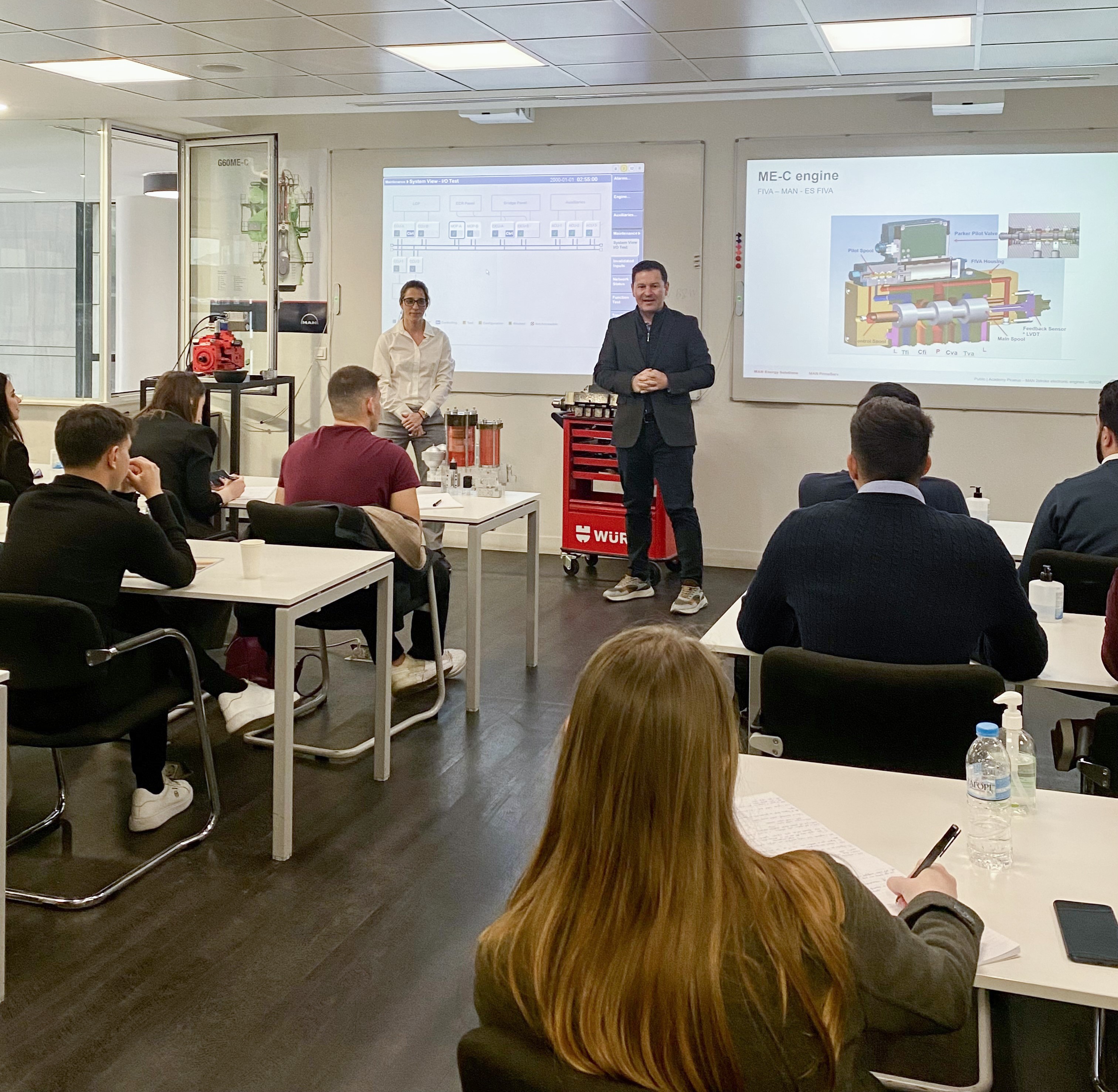 Κατά τη διάρκεια του Workshop, το οποίο πραγματοποιήθηκε την Τρίτη, 26 Μαρτίου 2024, οι φοιτητές του Τμήματος Ναυπηγών Μηχανολόγων Μηχανικών του Εθνικού Μετσόβιου Πολυτεχνείου και του Τμήματος Ναυπηγών Μηχανικών του Πανεπιστημίου Δυτικής Αττικής, είχαν την ευκαιρία να ενημερωθούν για την ιστορική εξέλιξη των μηχανών των πλοίων, τη δομή αλλά και των τρόπο λειτουργίας των δίχρονων μηχανών της MAN, τις αλλαγές που έφεραν στον κλάδο οι ηλεκτρονικές μηχανές, τις προκλήσεις για το σχεδιασμό μηχανών διπλού καυσίμου, αλλά και τις συναρπαστικές προοπτικές που φέρνουν οι τεχνολογικές εξελίξεις στον κλάδο.