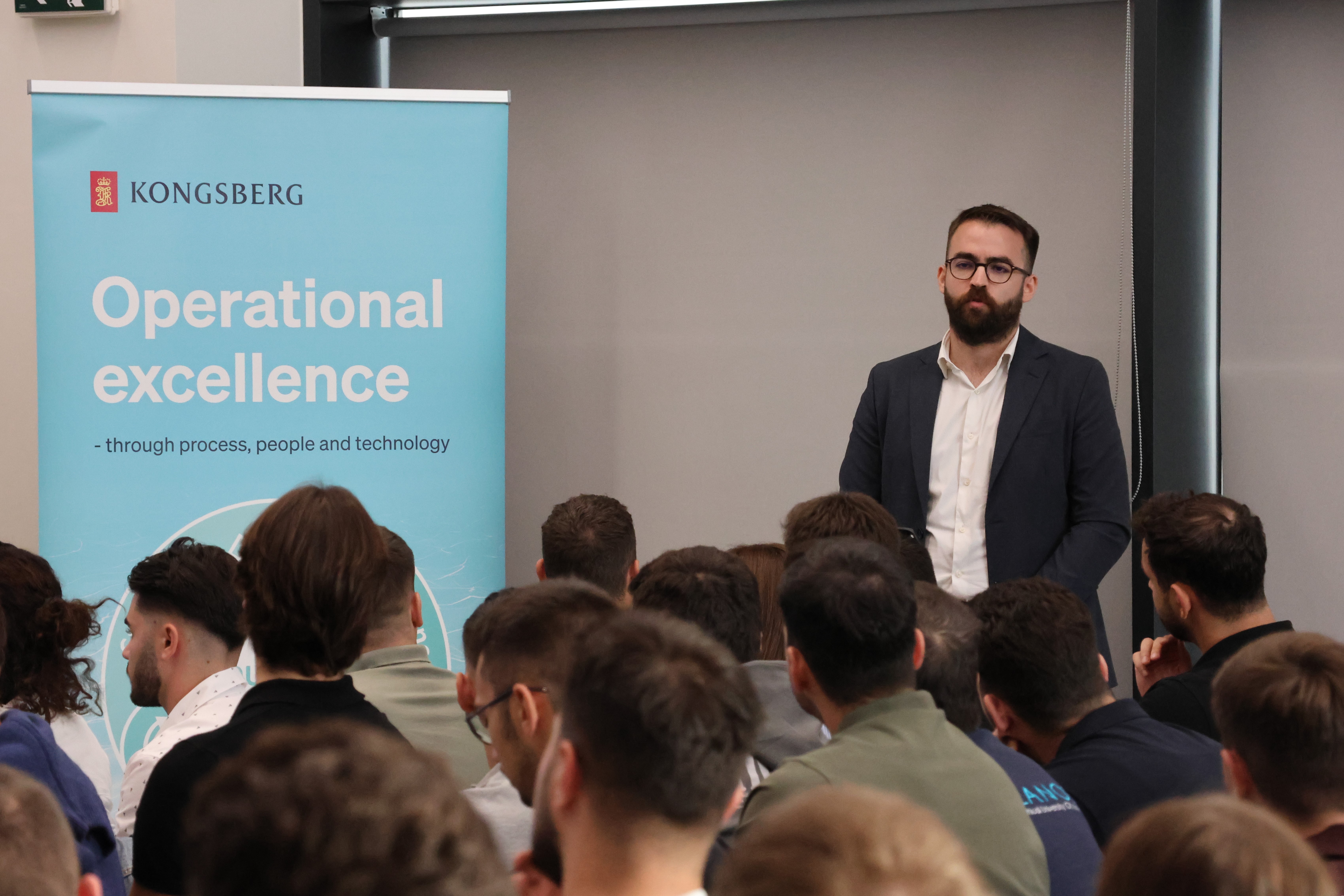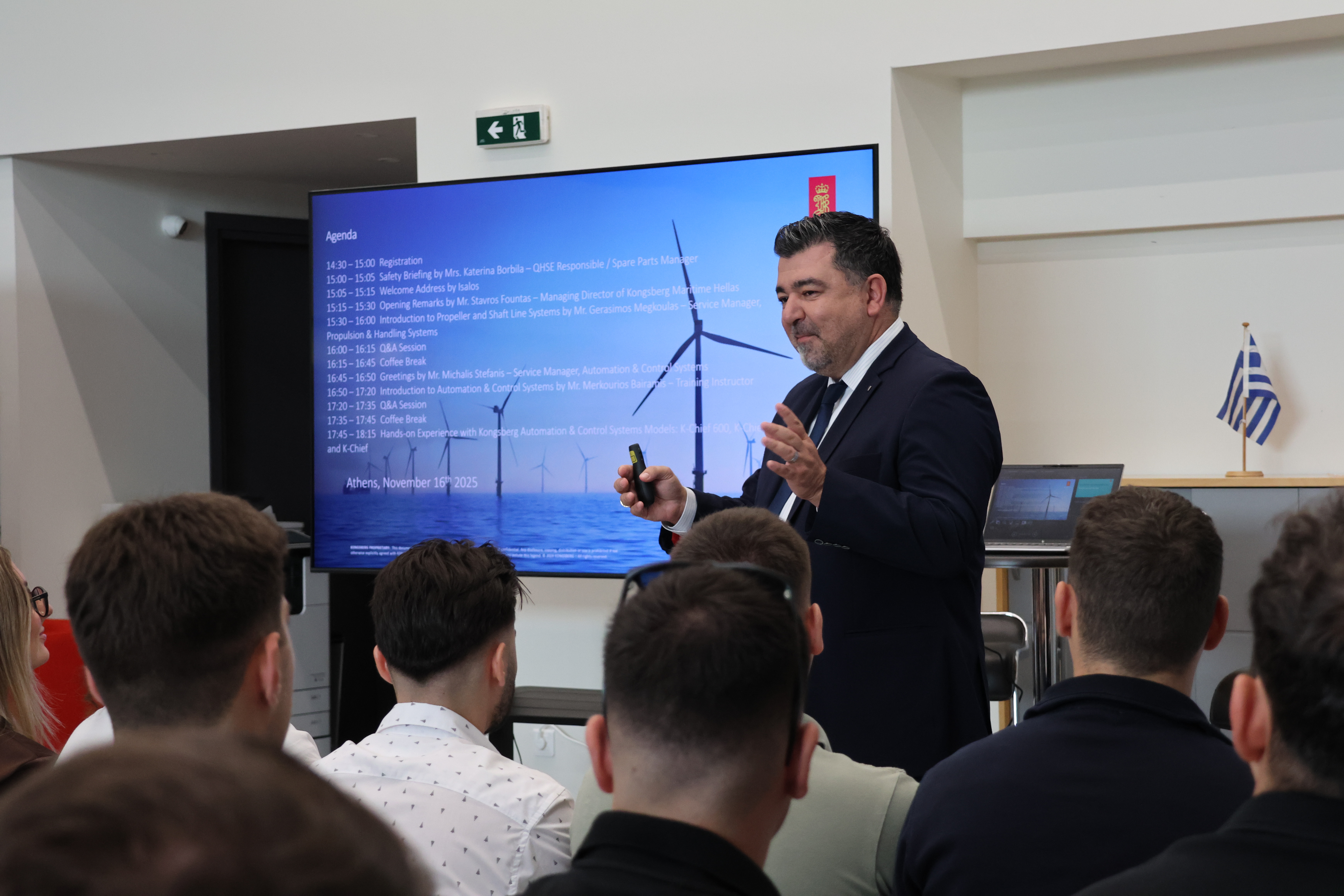 Το πρόγραμμα της επιμορφωτικής επίσκεψης ξεκίνησε με τον εναρκτήριο χαιρετισμό του κ. Σταύρου Φούντα, Managing Director της Kongsberg Maritime Hellas, ο οποίος καλωσόρισε το κοινό και αναφέρθηκε συνοπτικά στη φιλοσοφία και στο όραμα της εταιρείας.