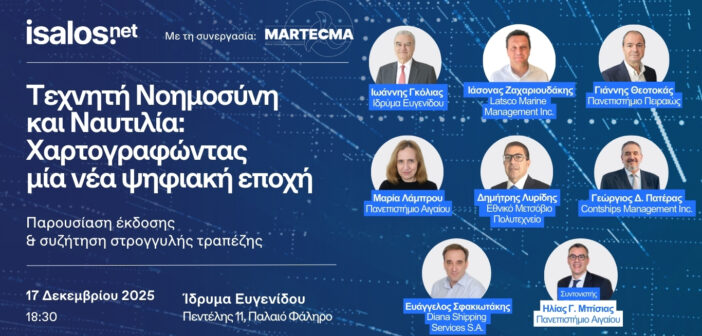 Με αφορμή την πρόσφατη έκδοση του επιστημονικού συγγράμματος «Artificial Intelligence in Shipping, The State of Digital Innovation» (εκδόσεις Taylor & Francis, 2025), της καθ. Μαρίας Λάμπρου (ΤΝΕΥ-Πανεπιστήμιο Αιγαίου) η Isalos.net, με τη συνεργασία της MARTECMA, διοργανώνει την εκδήλωση με τίτλο «Τεχνητή Νοημοσύνη και Ναυτιλία: Χαρτογραφώντας μία νέα ψηφιακή εποχή».