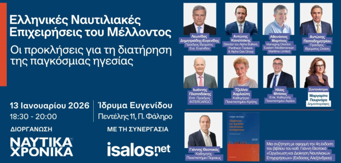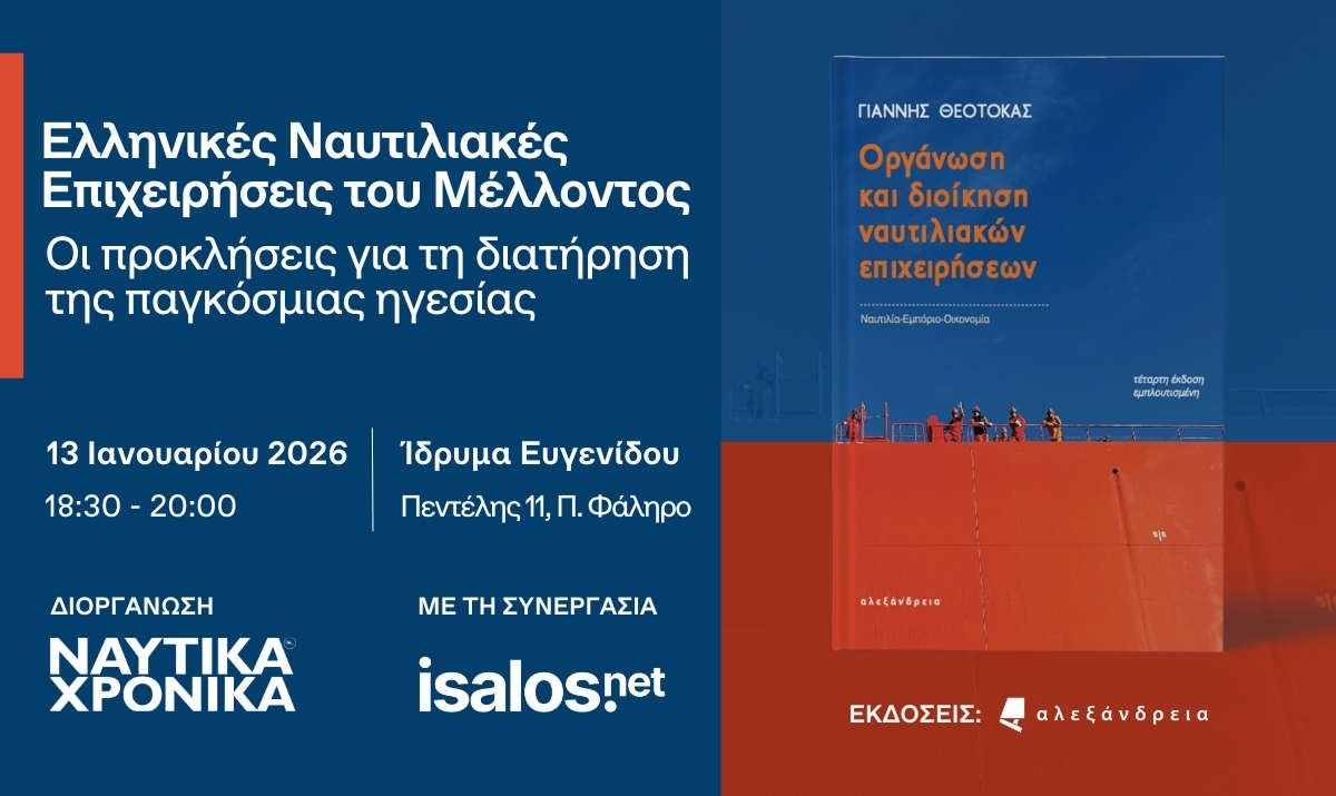 Τα Ναυτικά Χρονικά, με τη συνεργασία της Isalos.net, διοργανώνουν τη συζήτηση με θέμα: «Ελληνικές Ναυτιλιακές Επιχειρήσεις του Μέλλοντος – Οι προκλήσεις για τη διατήρηση της παγκόσμιας ηγεσίας», με αφορμή την 4η έκδοση του βιβλίου του καθ. Γιάννη Θεοτοκά «Οργάνωση και Διοίκηση Ναυτιλιακών Επιχειρήσεων» από τις Εκδόσεις Αλεξάνδρεια.