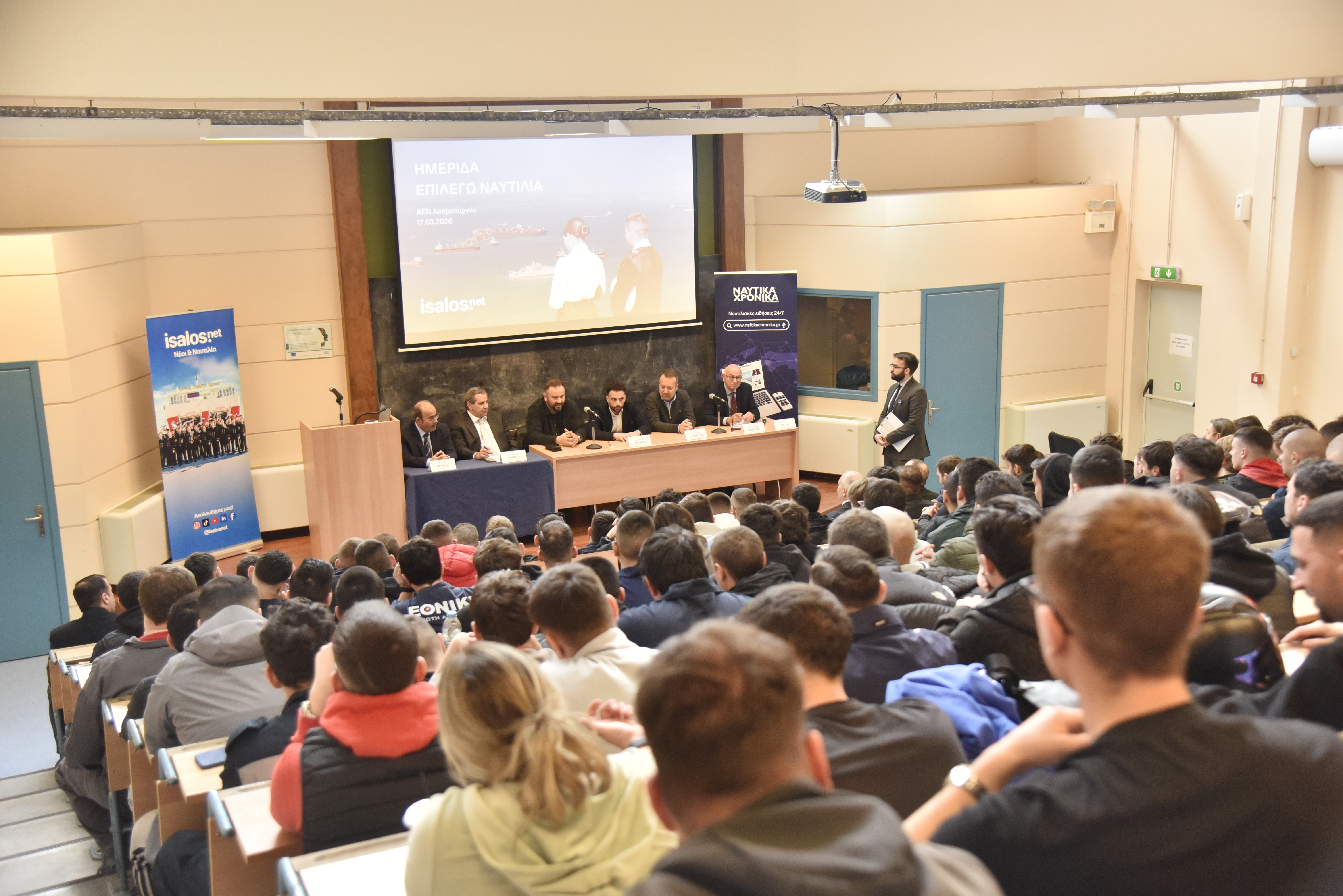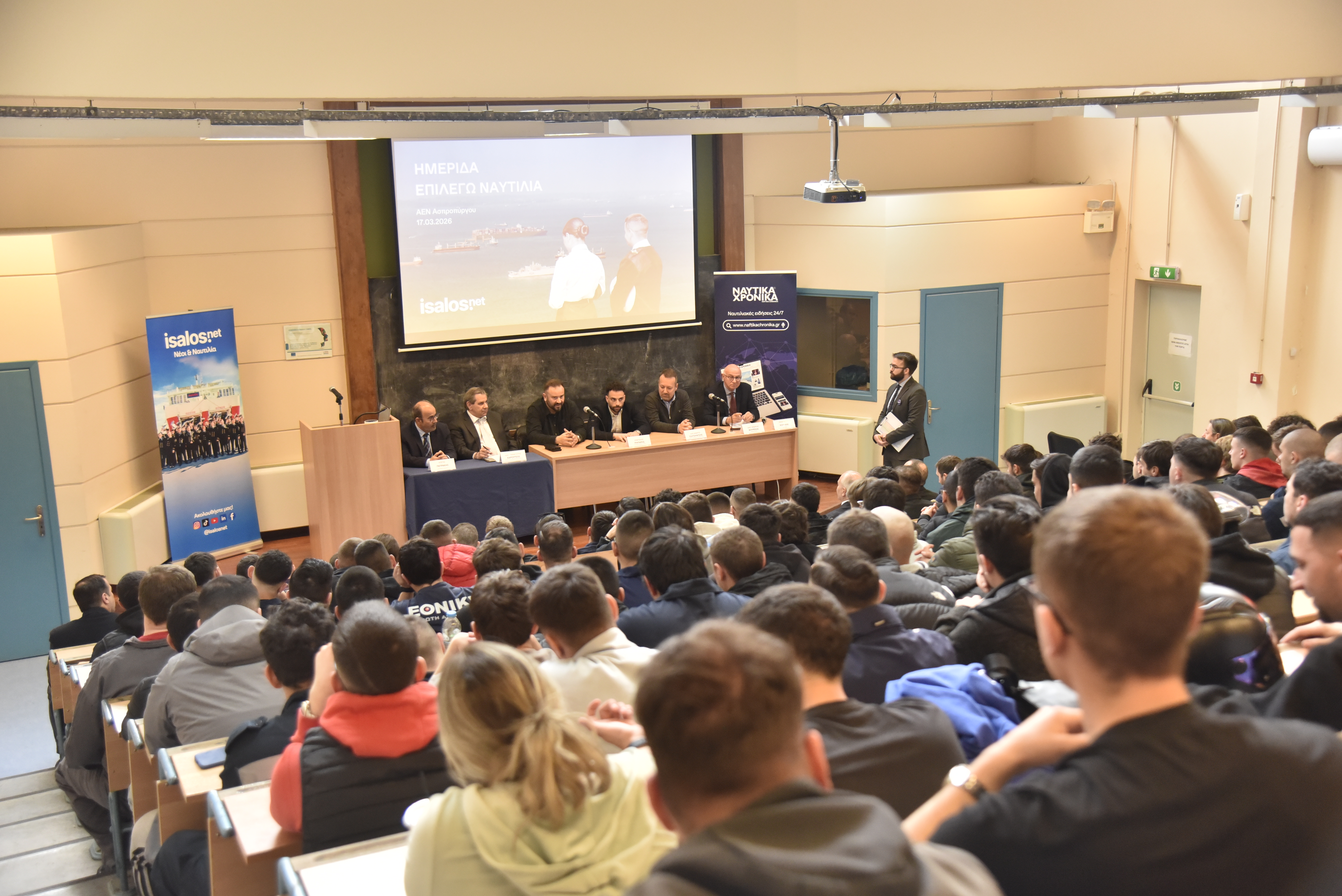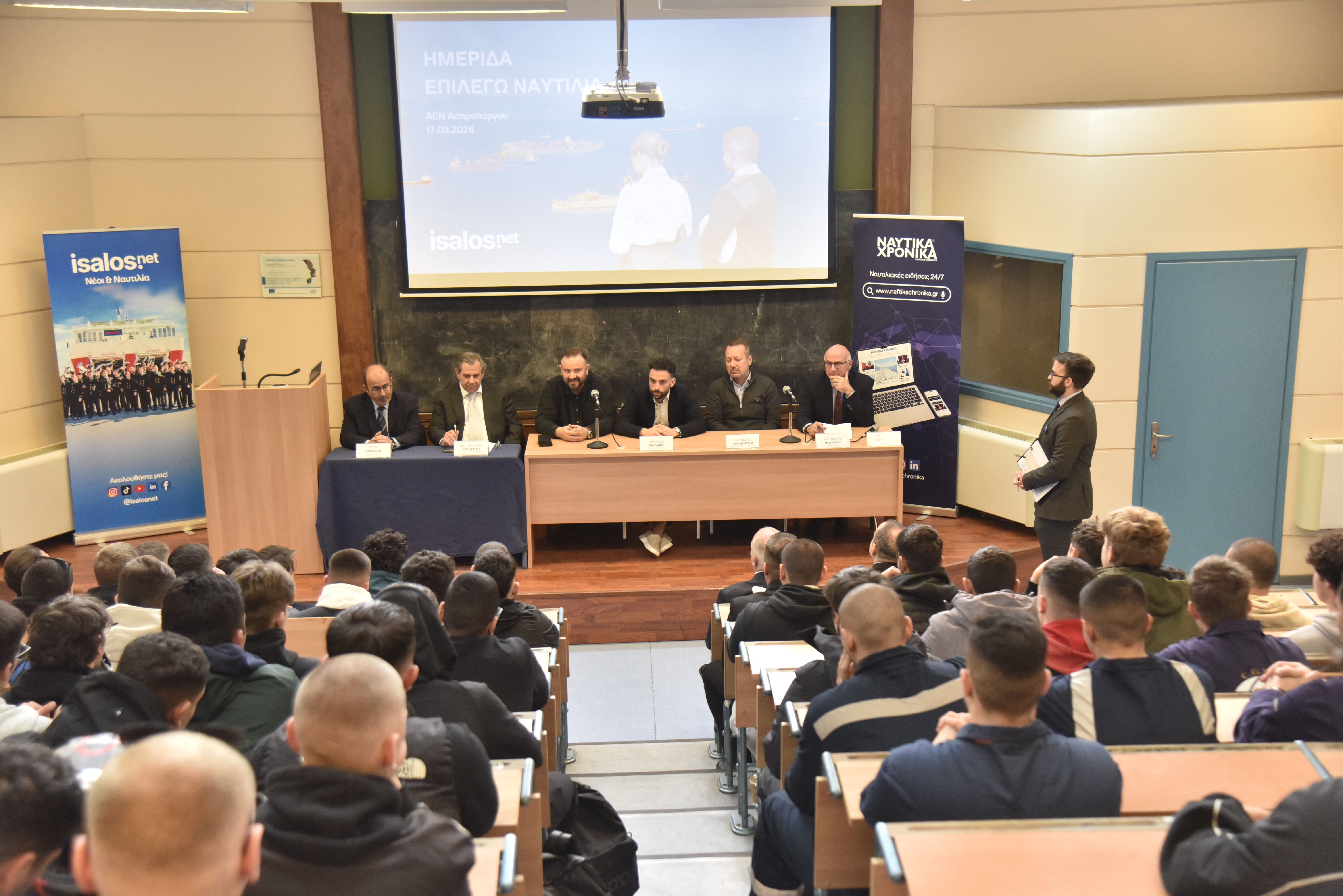 Οι εγκαταστάσεις της μεγαλύτερης Ακαδημίας Εμπορικού Ναυτικού της χώρας αποτέλεσαν τον επόμενο σταθμό των δράσεων της Isalos.net, που επικεντρώνονται στους σπουδαστές και στις σπουδάστριες των ΑΕΝ όλης της χώρας. Πιο συγκεκριμένα, την Τρίτη 17 Μαρτίου 2026 έλαβε χώρα η 38η κατά σειρά ημερίδα «Επιλέγω Ναυτιλία», η οποία έδωσε την ευκαιρία στους σπουδαστές και στις σπουδάστριες της ΑΕΝ Ασπροπύργου να συνομιλήσουν με εκπροσώπους της ελληνικής ναυτιλιακής κοινότητας.