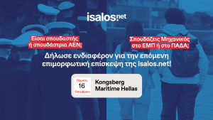 H Isalos.net και η Kongsberg Maritime Hellas, με αφορμή την έναρξη του ακαδημαϊκού έτους διοργανώνουν επιμορφωτική επίσκεψη στις εγκαταστάσεις της Kongsberg στο Παλαιό Φάληρο, την Πέμπτη 16 Οκτωβρίου 2025. Χάρη στη συνεργασία και φιλοξενία της εταιρείας, κατά τη διάρκεια της επιμορφωτικής επίσκεψης, μέσα από εξειδικευμένες παρουσιάσεις από εκπροσώπους της Kongsberg Maritime Hellas, οι συμμετέχοντες/ουσσες θα